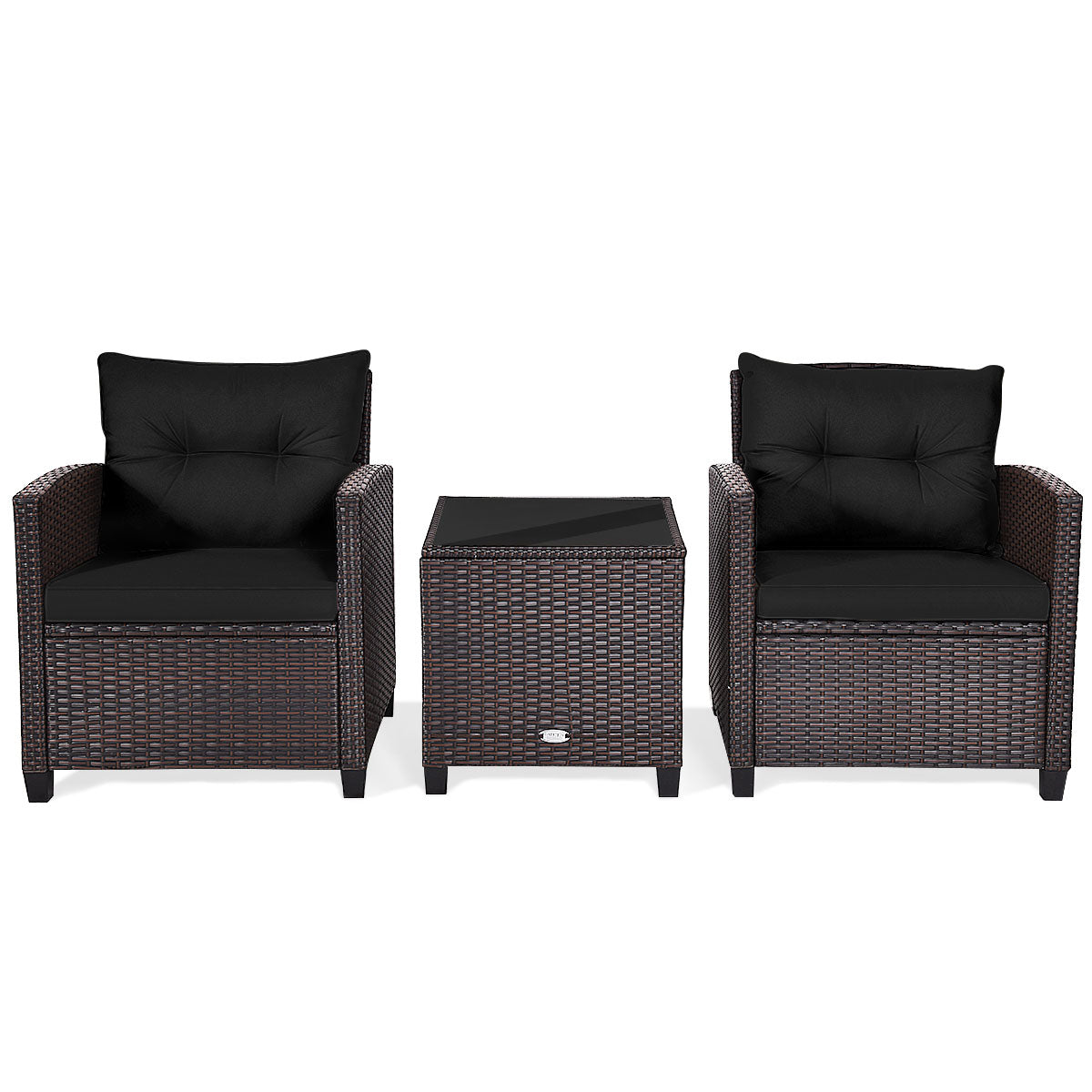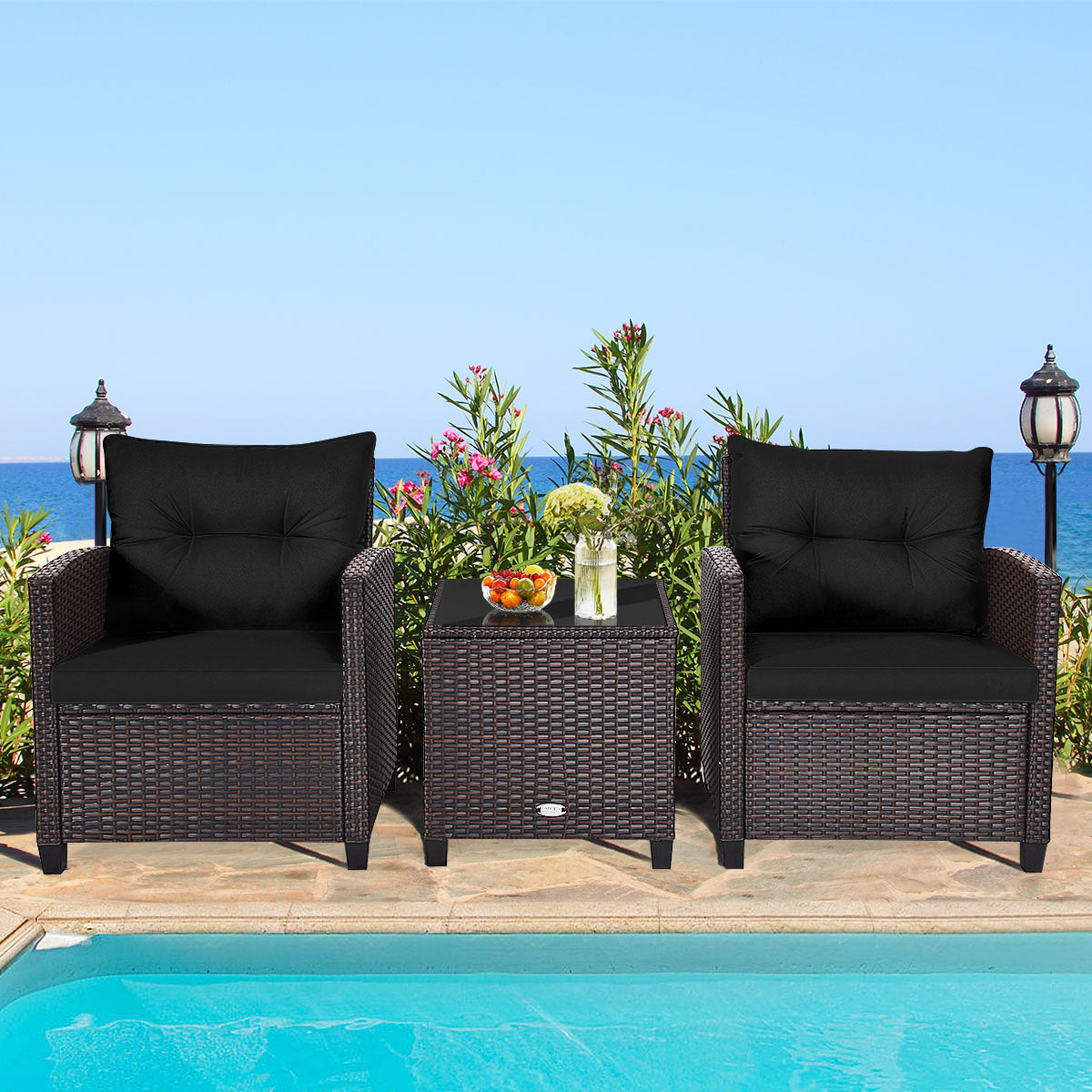 Patiojoy 3PCS Wicker Cushioned Conversation Set Outdoor Rattan Furniture w/Beige/Red/Black/Navy/Off White/Turquoise Cushions
